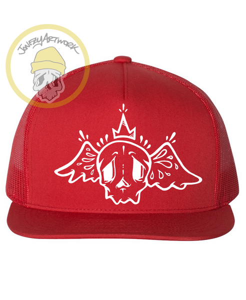 RED SNAPBACK WITH WHITE SIGNATURE PRINT
