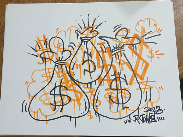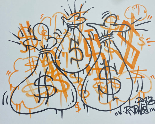 *original sketch, of 3 money bags with background in orange with images of dollar signs $$$ and clouds with drip. Great for any collection